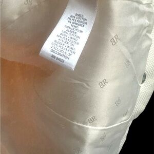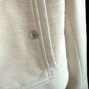 This Banana Republic jacket in an off white hue offers a sophisticated touch with its fitted silhouette and structured shoulders. Ideal for both day and evening wear, its versatile design complements a variety of outfits from jeans to a smart dress pant. The snaps and zipper closure make for a sleek look. VERY well made, fully lined and has great soft leather detail on the pockets.