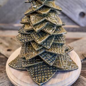 Textured Clay Pottery Christmas Tree w/ Individually Textured and Stacked Pottery Pieces Placed Perfectly to Create This Unique Handmade Design, It sits on a raw wooden base and has gold toned botanical leaf tree topper on one side and a clay textured star on the other side, Eclectic Christmas Decor, Signed by Artist