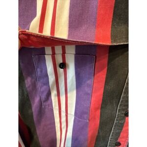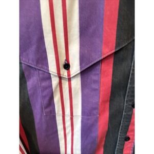 This shirt is in very good condition overall. Has a very small stain on the left shoulder but its hardly noticeable. This is a unique brushpopper because of the fact that it has a caped yoke. Also the colorway with the broad purple stripes accented by the more narrow red, black and white stripes really pops. This shirt has extra long tails to help keep it tucked in and is a size 17-35 which translates to an XL. Comes from a smoke free home.
