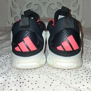 Stylish sneakers featuring red laces. Black upper with sleek white sole. Ideal for active play. Anthony Edwards basketball sneakers by Adidas. Size 10.5, in excellent condition.