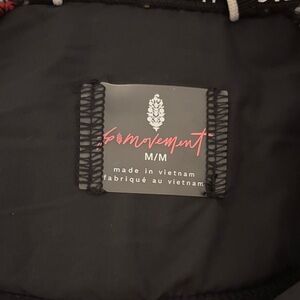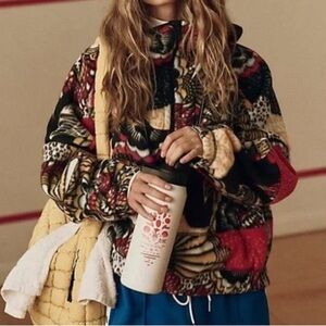 Eye-catching jacket with a vibrant multicolor pattern made of fleece for warmth. Features a mix of red, yellow, black, and white. Half zip pullover with two front zip pockets and a hood. Large buti logo at back. This pullover hits at the waist.