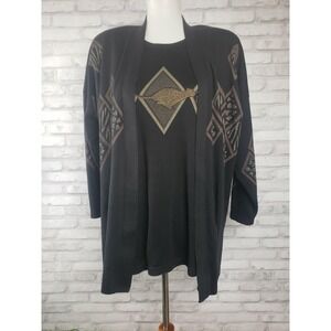 Black cotton knit T-shirt fabric lightweight cardigan with a variety of animal prints, and t-shirt with a cheetah design. Back is plain on both pieces.