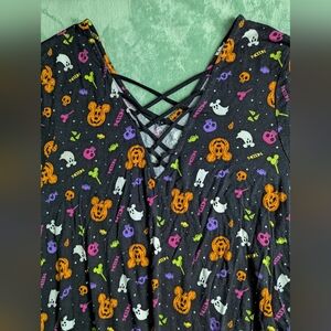 Black top with Halloween-themed prints. Features pumpkins, ghosts, and bats in orange, white, and purple.