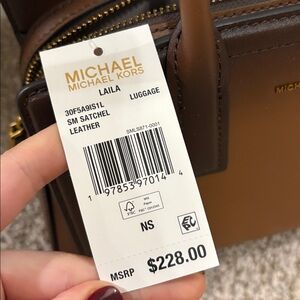 • Exterior: gold hardware, back slip and zip pocket, center zip compartment