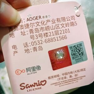 Sanrio license tag featuring pink background and red text. Includes QR code and holographic sticker.