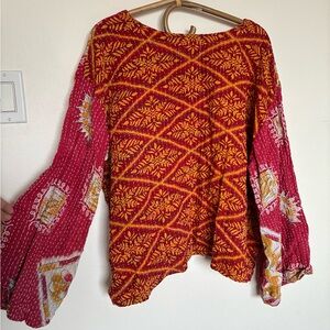 Vibrant boho long sleeve top, handmade from vintage textiles.