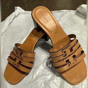 Elegant brown heeled sandals with signature Tory Burch design. Perfect for stylish outings.
