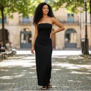 This elegant black strapless dress is perfect for any occasion. Its sleek design offers a timeless look.