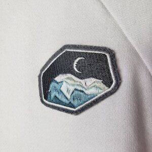 White sweatshirt, mountain themed patch on the front chest. Long sleeve.