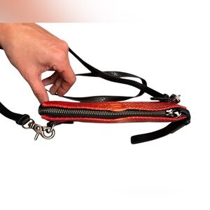 Stylish small red snakeskin crossbody bag with black accents. Has several compartments for cards and small items. Perfect for adding a bold touch to any outfit.