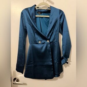Lulus Regal Aura Teal Blue Satin Long Sleeve Blazer Romper - Size XS
