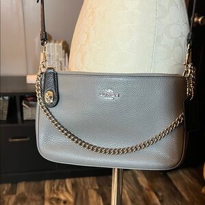 Chic Coach crossbody in grey leather. Features chain detail to be used as shoulder strap or decor and adjustable long strap. Perfect for everyday use.