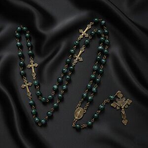 Dark Green Beaded Rosary Antique Brass Crosses Necklace NWOT