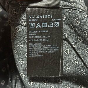 AllSaints men’s shirt, AllSaints Spadille shirt, AllSaints XS, black spade print shirt, designer button down, modern casual shirt, long sleeve viscose top, lightweight patterned shirt, AllSaints London men’s wear, minimalist streetwear