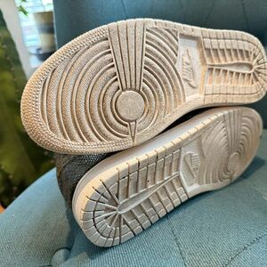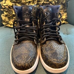 Stylish snakeskin, green and black, Nike Air Jordan 1 high-top sneakers with black laces. Perfect for a trendy look. Women’s size 9. Great condition.