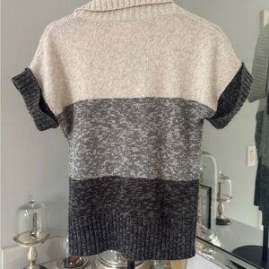 Stylish cowl neck sweater. Features short sleeves. Color block design.