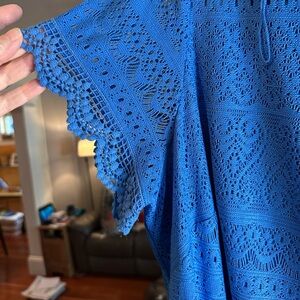 Elegant blue lace dress. Features short sleeves and intricate lace detailing. Perfect for any occasion.