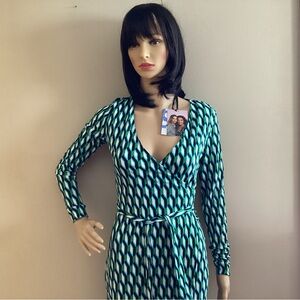 Diane von Furstenberg Women's Midi Wrap Dress NWT Deep V-Neck Long Sleeve Green