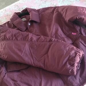 Stylish burgundy puffer jacket. Features front pockets and drawstring hem. Perfect for layering. Has a couple marks, In photos. could come out in the wash