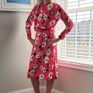 Vintage 80s Blair Red Hibiscus Belted Longsleeve Wrap Midi Dress