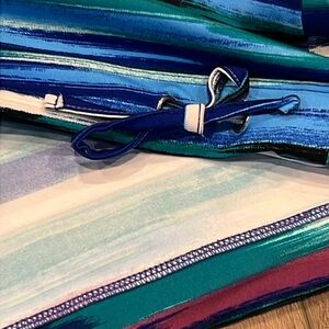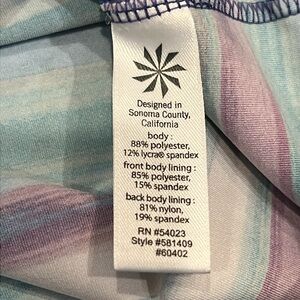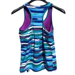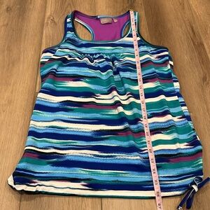 Athleta racerback swim/athletic tank in great preloved condition (extremely mild signs of washing wear, no holes/no stains noted). Adjustable waist tie, colorful striped design, stretchy material, built in shelf bra (I don’t believe there is any padding, if there is it’s super light). Size listed is medium. Approximately 26” in length and 17” armpit to armpit laying flat (easily stretches to 18.5”).