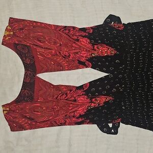 Design: Sleeveless fit-and-flare mini with a flowy, swingy skirt and a plunging V-neckline featuring bold, colorful trim