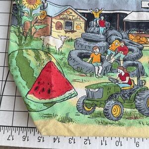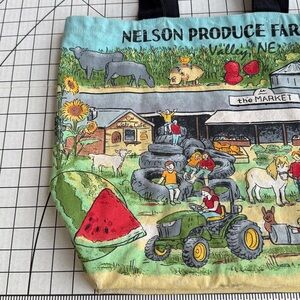 Reusable cotton tote bag featuring a charming illustrated farmers market and farm scene with barns, animals, tractor, and fresh produce. The design reads “Nelson Produce Farm” and has a nostalgic, community-market feel.