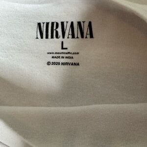 Tags: The internal tags show NIRVANA, Merch Traffic, Primark, and © 2025 NIRVANA, confirming its licensed nature and recent production.