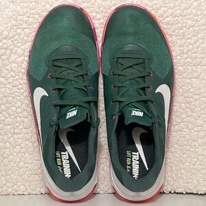 Nike Mens Green Metcon 2 Amp Rory Mcilroy 'Strength in Bloom' Edition Crossfit Sneakers Shoes. Color: Green w/Orange/Fuschia. Pre-Owned Condition - refer to pictures for description of shoes. No Rips or Tears. Smoke-Free.