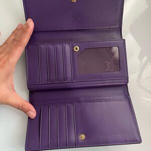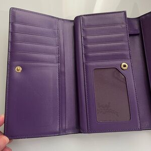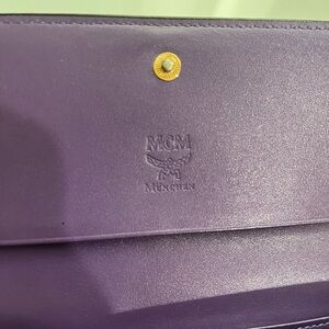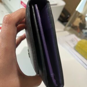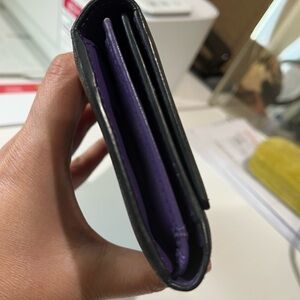 Authentic pre-loved. Black Saffiano with rich purple color interior. MCM logo has darkened. Plenty of compartments and card slots with zippered coin pocket.