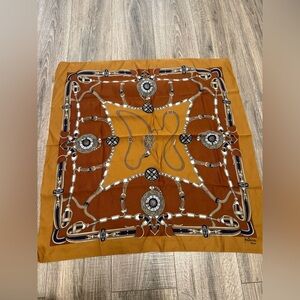 The VTG Scarf by Patricia Paris is a vintage women's accessory featuring a classic baroque pattern in black, brown, and gold colors. Made in Italy from polyester, this large square scarf measures 30x30 inches and is perfect for all seasons. With its stylish design and luxurious feel, this scarf can be worn in a variety of ways to elevate any outfit, making it a versatile and timeless piece for any woman's wardrobe.