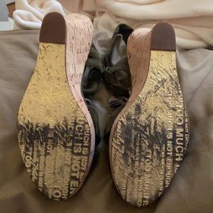 Beautiful sage green suede wedges with rose-like decorations on top. Excellent condition, only worn once. Can’t find a size anywhere on them but I am sure they are a 6.5 and fit true to size.