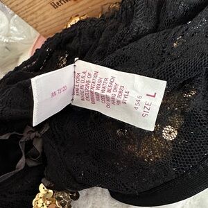 Dazzling black teddy with gold sequin trim. Sheer lace design. Perfect for a glamorous night.