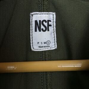 NSF Polly Utility Zip Front 100% Cotton Belted Mini Olive Green Dress. Gold tone front zip closure. Elasticized waist with matching sash belt. Two slant side pockets, Two chest patch pockets, Two back pockets. Relaxed short dolman sleeves. Made in USA. Fabric: 100% Cotton.