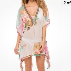NWOT!! Z & L Europe Floral Pom Pom Cotton Kimono Caftan Tunic Cover Up