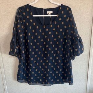 Stylish women’s navy & ivory striped cardigan sweater in size Medium. Features gold tone buttons, V-neckline and a relaxed, slightly cropped fit in a soft knit fabric.