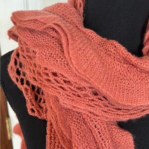 Chic coral scarf with delicate lace details. Lightweight and stylish. Ideal for layering.