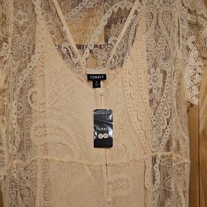 Chic cream lace maxi dress. Features delicate lace detailing. Perfect for elegant occasions.