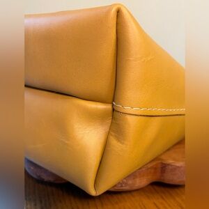 Made entirely of durable unlined premium full-grain leather, and dyed in small batches in this beautiful Mango Yellow color , this practical tote measures approximately 14” wide across the top, and 12” wide across the bottom. It is 10” high, and 5 1/2” deep with a 4” handle drop, and a 39”- 48” adjustable crossbody strap drop.