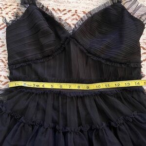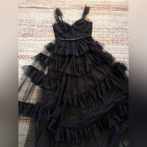 Chic black dress with layered ruffles. Perfect for prom or formal events. Elegant and stylish design.
