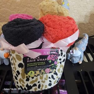 Chic hair wraps by Betsey Johnson. Includes black, red, orange, and tan wraps. Comes with a leopard print basket.