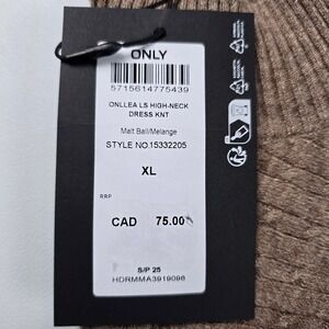 New with tags, ONLY High Neck Sweater Dress in Malt Ball Tan, size XL. Stay cozy and chic in this long-sleeve knit dress featuring a classic high mock neck and a flattering tie-waist belt. Crafted from a soft, stretchy ribbed cable knit fabric, this dress offers a comfortable, form-fitting silhouette that hits above the knee. The warm "Malt Ball" melange color makes it a versatile staple for your cool-weather wardrobe. Features: - material: soft viscose blend (50% Viscose, 27% Nylon, 23% Polyester) - textured cable knit design for added visual depth - classic high mock neck for warmth and style - removable tie-waist belt for a custom, cinched silhouette - stretchy ribbed construction ensures a comfortable fit - long sleeves with fitted cuffs - versatile knee-length cut - MSRP: $75.00 CAD Perfect for: Office wear, autumn date nights, holiday gatherings, or stylish weekend brunches. knit dress, sweater dress, long sleeve, high neck, belted, casual, winter fashion, fall fashion, midi dress, pullover dress, neutral tone, ribbed knit, XL dress No stains, tears, pilling or holes - new item • Bundle multiple items to save on shipping • See photos for specific measurements to ensure fit • Stored in a smoke-free, pet-free environment • Orders generally ship within 2 business days Please don't hesitate to reach out with any questions!