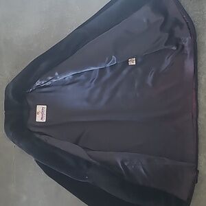 Vintage Faux Fur Coat by Monterey Fashions. The chic high shawl collar makes this the perfect piece to upgrade a boring outfit on a chilly day. Black. The tag lists size 12. This piece is more like a size Large. There are more measurements listed below. 50% Modacrylic 50% Acrylic. Made in the USA. In excellent condition inside and out.