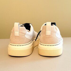 Size 9, worn once, Ferragamo Cassina Low-Top Sneakers for Women suede tan with white, navy laces, comes with new white laces in Salvatore Ferragamo bag, cloud white calf leather-blend perforated Gancini logo detail round toe front lace-up fastening chunky rubber sole.