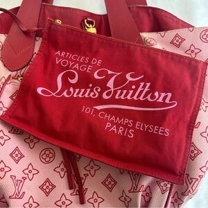 Elevate your style with this Louis Vuitton women's bag in striking red and pink. Perfect for any summer and vacation, this bag combines luxury and functionality. This bag will fit your laptop for your commute to work.