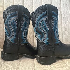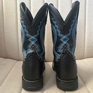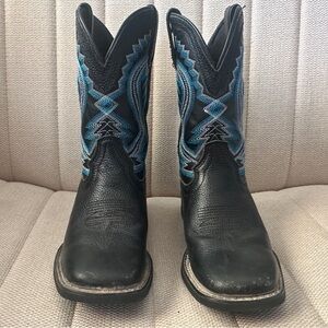 Durango kids boots with striking blue accents, beautiful stitching. Durable and stylish for young adventurers.
