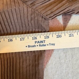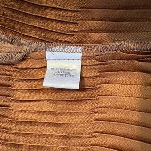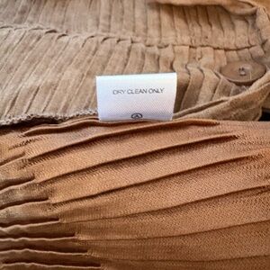 Beautiful chocolate brown pleated jacket. This unlined jacket has a very cool, unique pleats all over. Full button down front in brown plastic buttons. Collared. Long sleeve. Single button closure at wrist. Shoulder pads (that could be removed if you want). 100% Polyester. Dry clean only.