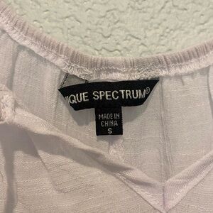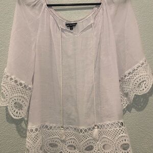 Chic white blouse with bohemian lace accents. Features a stylish tassel tie. White is in good color.