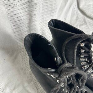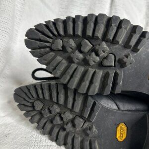 Very good preowned condition— minor creasing, the aglets are weirdly flattened (maybe from storage?), and there is some fraying at the top collar of the right boot (last photo). Genuine leather upper with Vibram sole.
