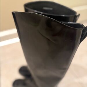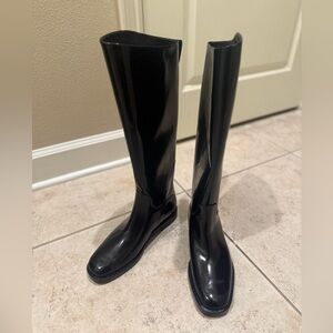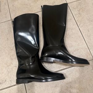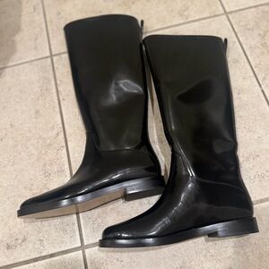 New never worn. This piece features a soft, square toe, welt detailing, pull-on knee-high length with a padded insole in thick, premium sourced LWG-certified leather. A very slight dent in material at top of left side of right boot as shown. Will come out with wear